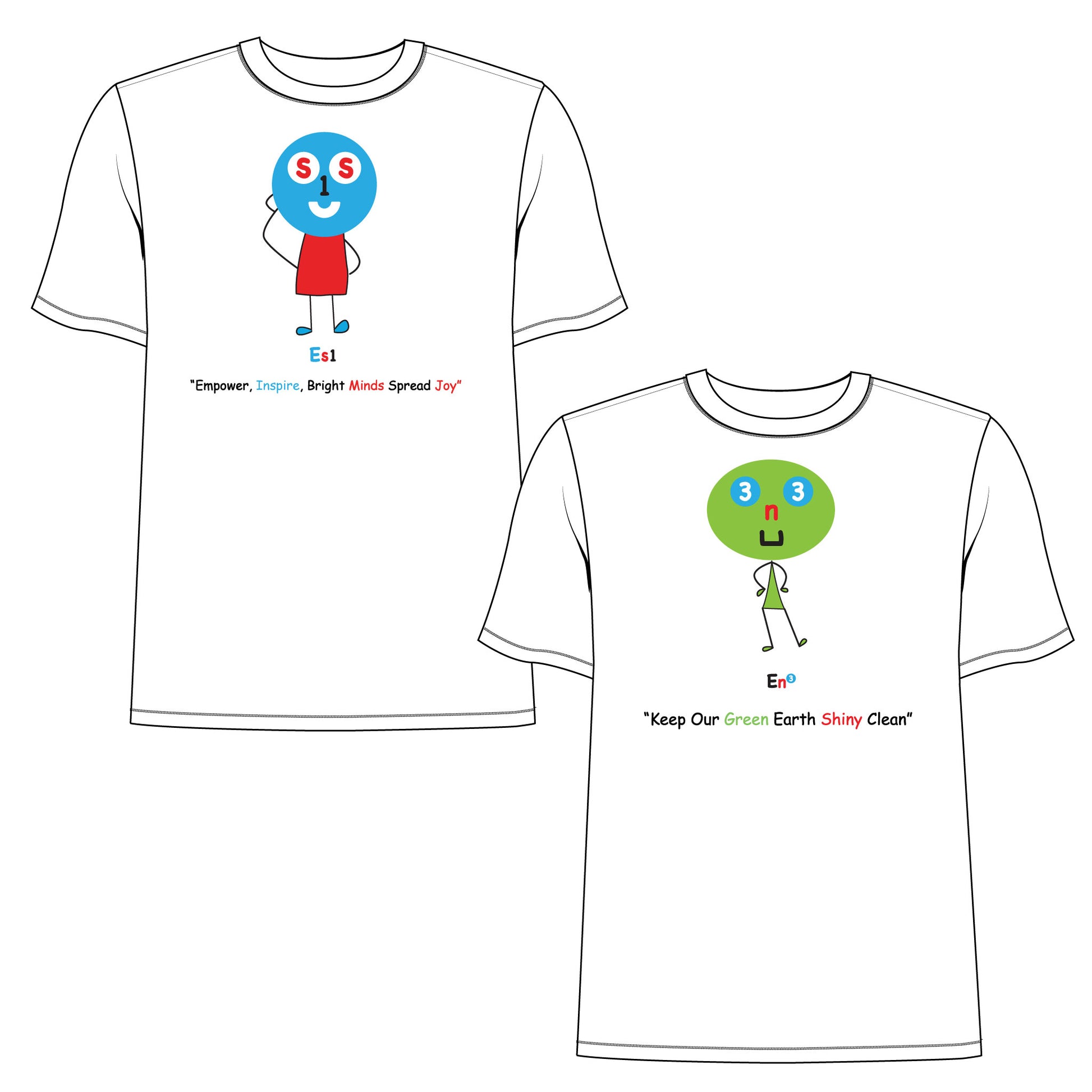 2 Pack T-Shirts 1 Pc ES1 Education Mascot Logo " Empower, Inspire, Bright Minds Spread Joy" 100% Cotton Unisex Short Sleeve T-Shirt & 1 Pc EN3 Environment Mascot Logo "Keep Our Green Earth Shiny Clean" 100% Cotton Unisex Short Sleeve T-Shirt